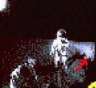 (1) Ga ada bintang di langit.(2) Tuh liat ada bayangan orang yang lagi ambil foto di visor (kaca helm) Neil Amstrongnya. Liatlah bayangannya, masuk akal banget kalo kita berpikir bahwa matahari akan tepat di belakang Armstrong? Terus bagaimana hal itu juga tampak bahwa badan Armstrong menerima bentuk cahaya dari sisi kanan juga. Perhatikan bagaimana bahunya jauh lebih baik terang dari yang kiri. Objek yang ditandai huruf C adalah kamera ditempatkan pada dada astronauts. Kalo gambar ini benar-benar diambil oleh orang yang kita lihat di visor maka orang tersebut akan berada setidaknya 5 meter, yang ga ada lagi anggota Apollo . Aneh juga, kamera itu menunjuk ke atas untuk gambar ini karena jika kita melihat latar belakang jelas bahwa foto itu diambil pada sudut menurun, yakni dari posisi yang lebih tinggi. Dan bayangan dari orang yang mengambil foto menunjukkan bahwa dia berdiri lurus sempurna dan tidak berada pada ketinggian seperti bukit atau batu.